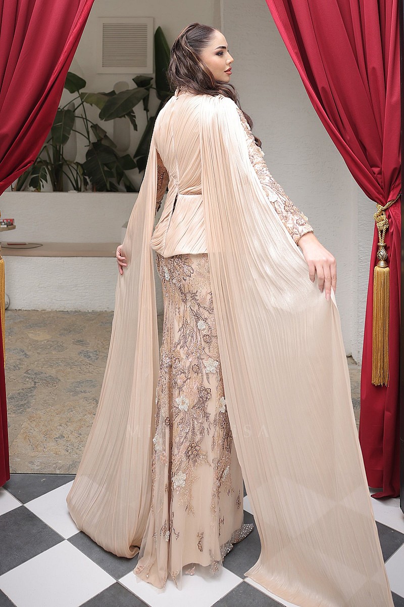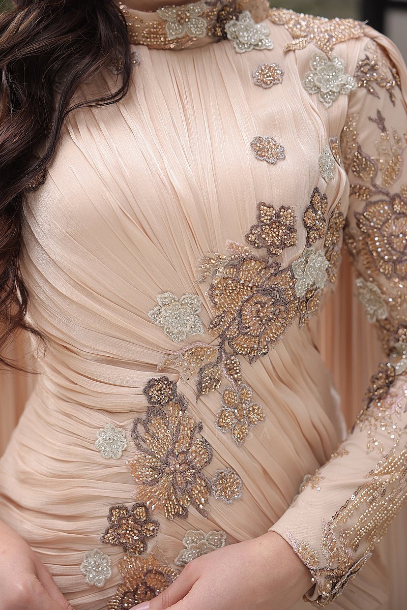 Drapeli Bel Detaylı Çiçek İşlemeli Veyra Abiye - Bej