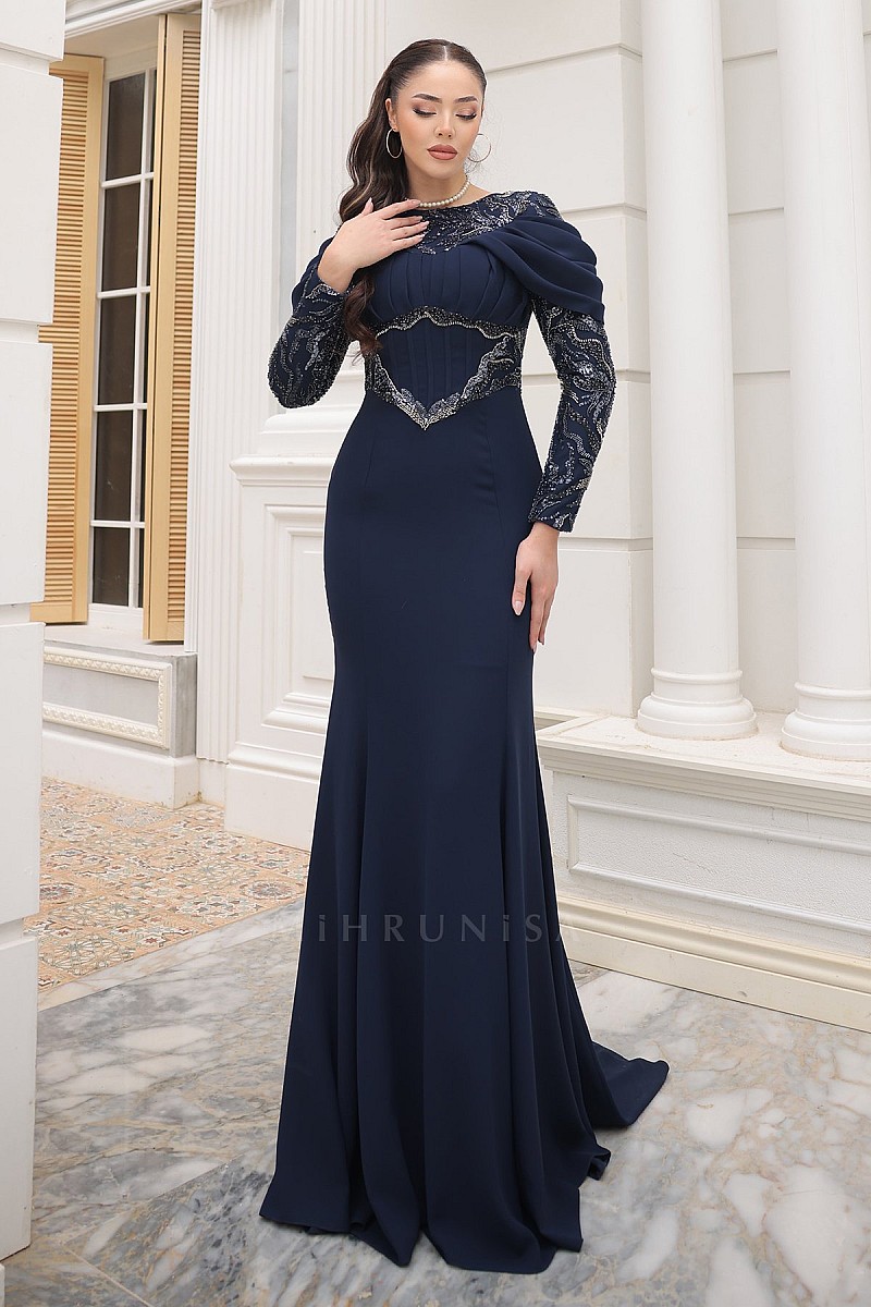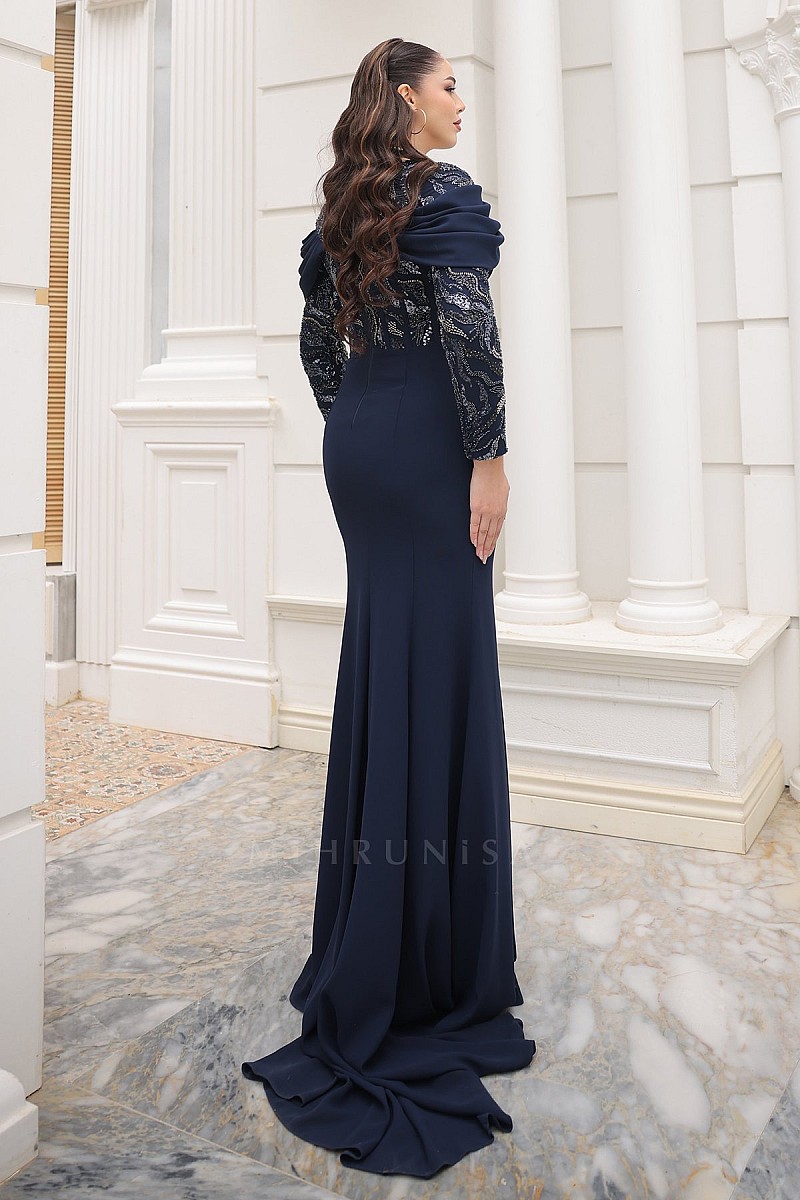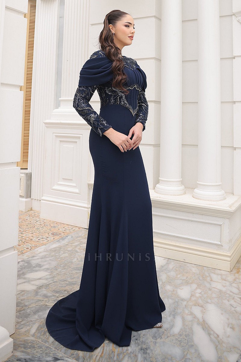 Drapeli Omuz Detaylı Dantel İşlemeli April Abiye - Lacivert