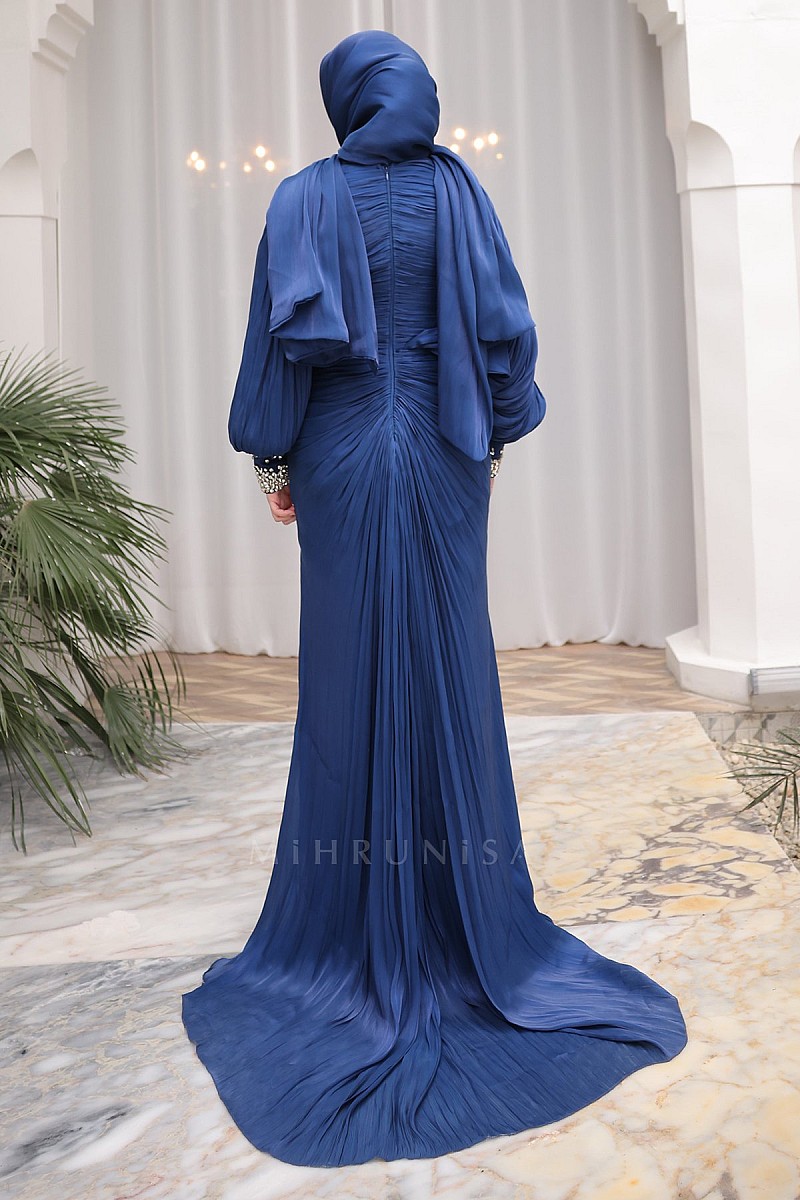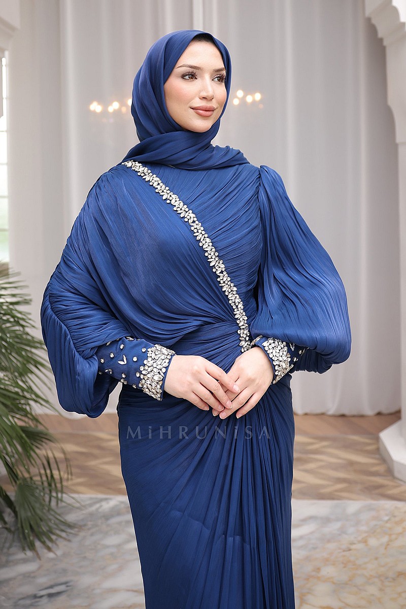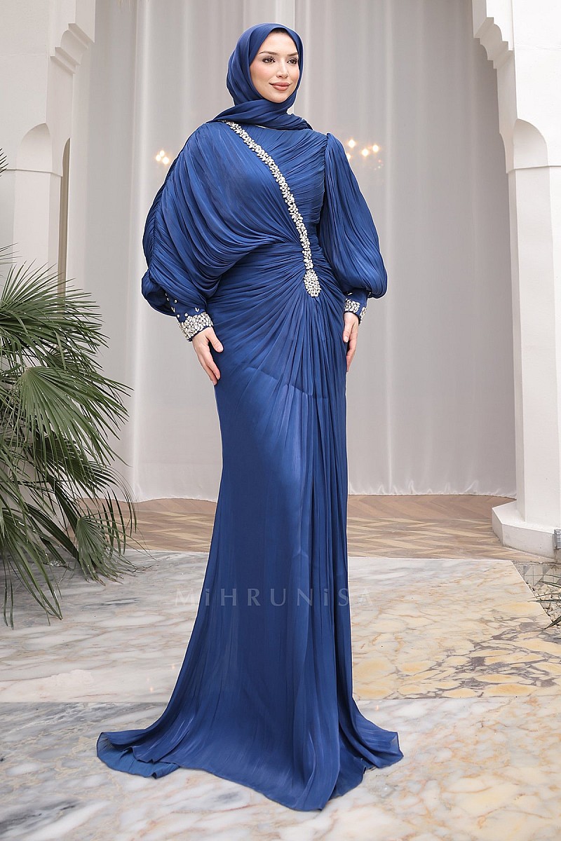Drapeli Taş Şerit Detaylı Marceline Abiye - İndigo
