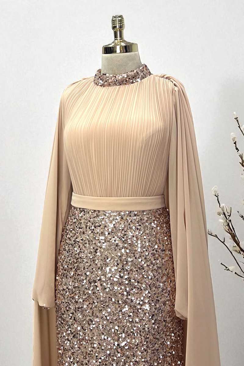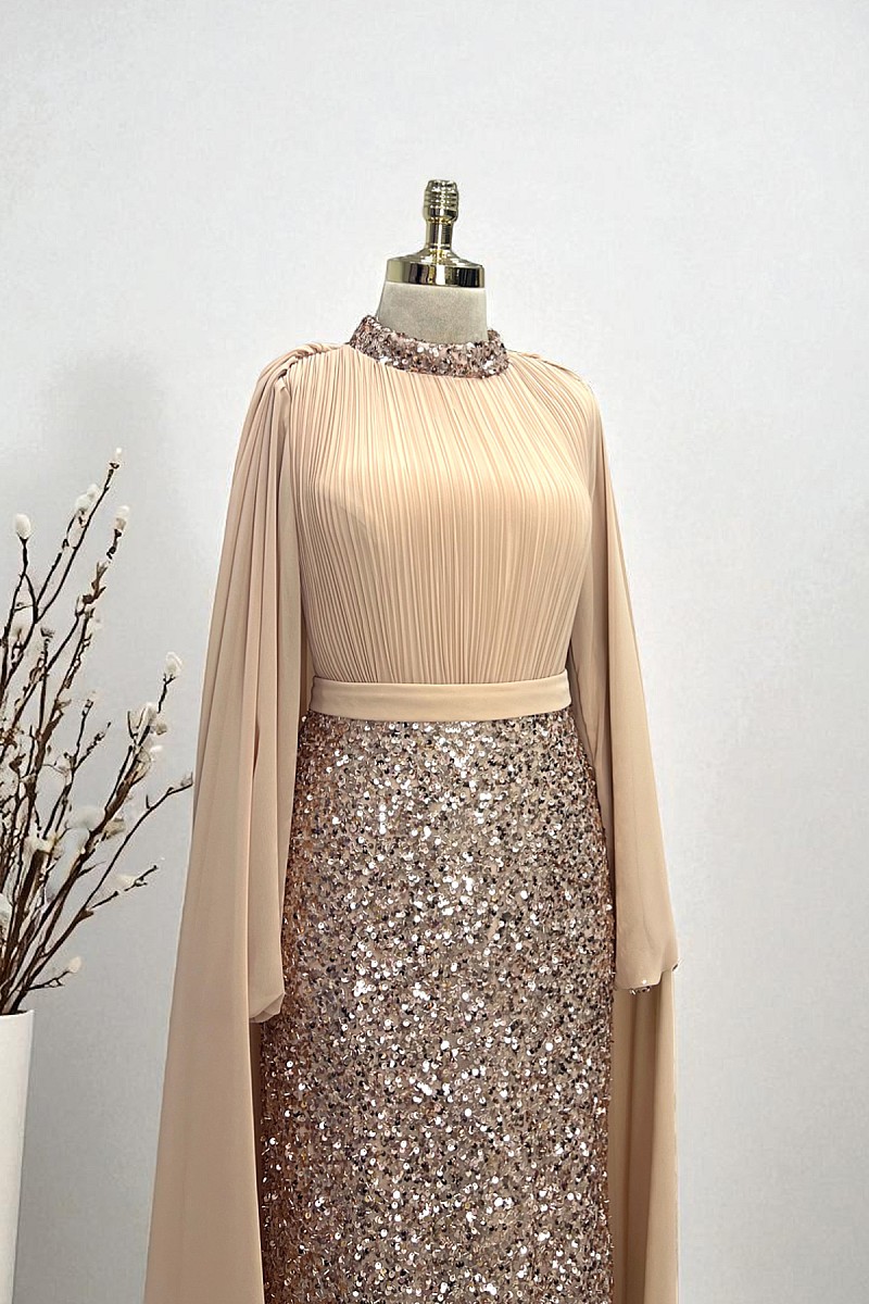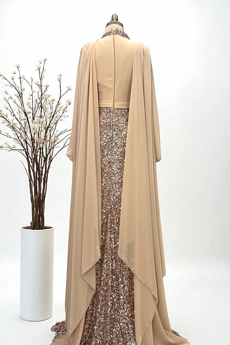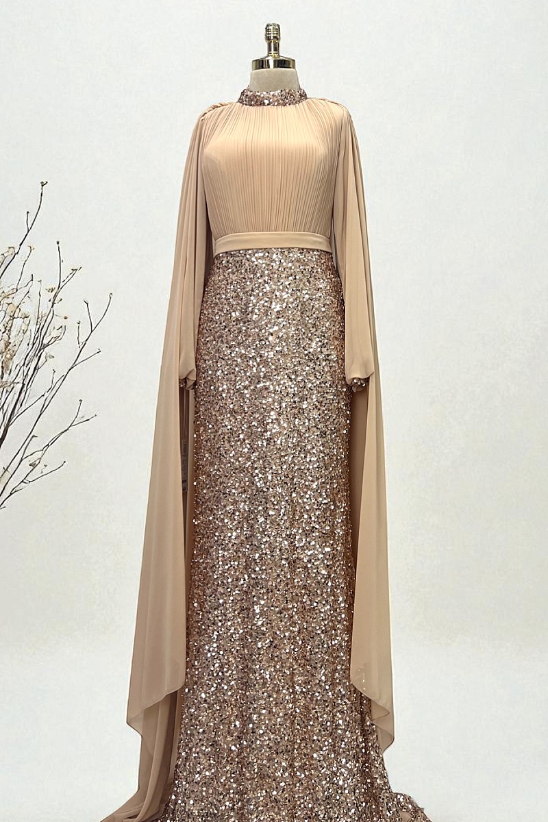 | ÜRÜN BİLGİSİ | Omuzdan şifon pelerinli, ışıltılı detayları ve akıcı tasarımıyla özel günlerde şık bir görünüm sunar. |