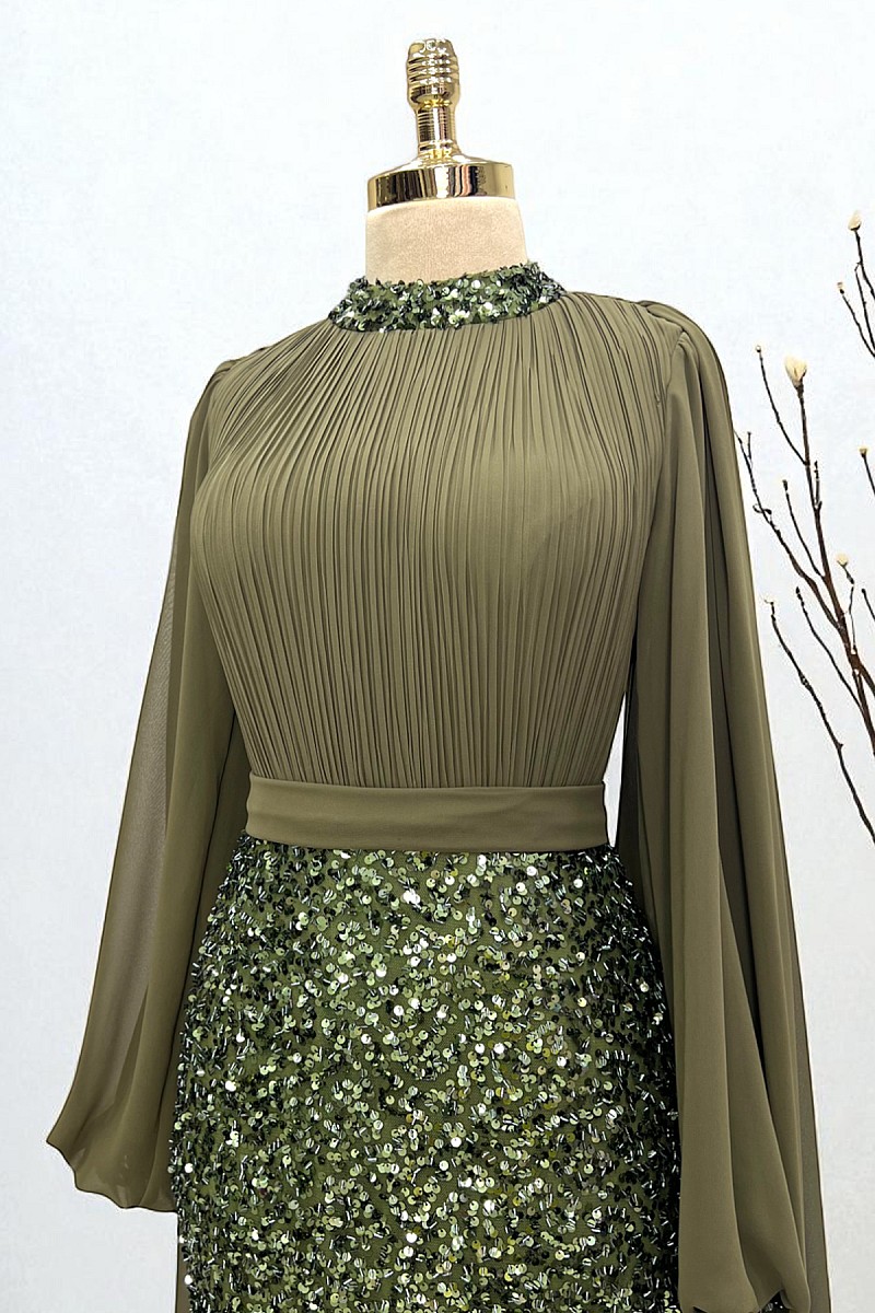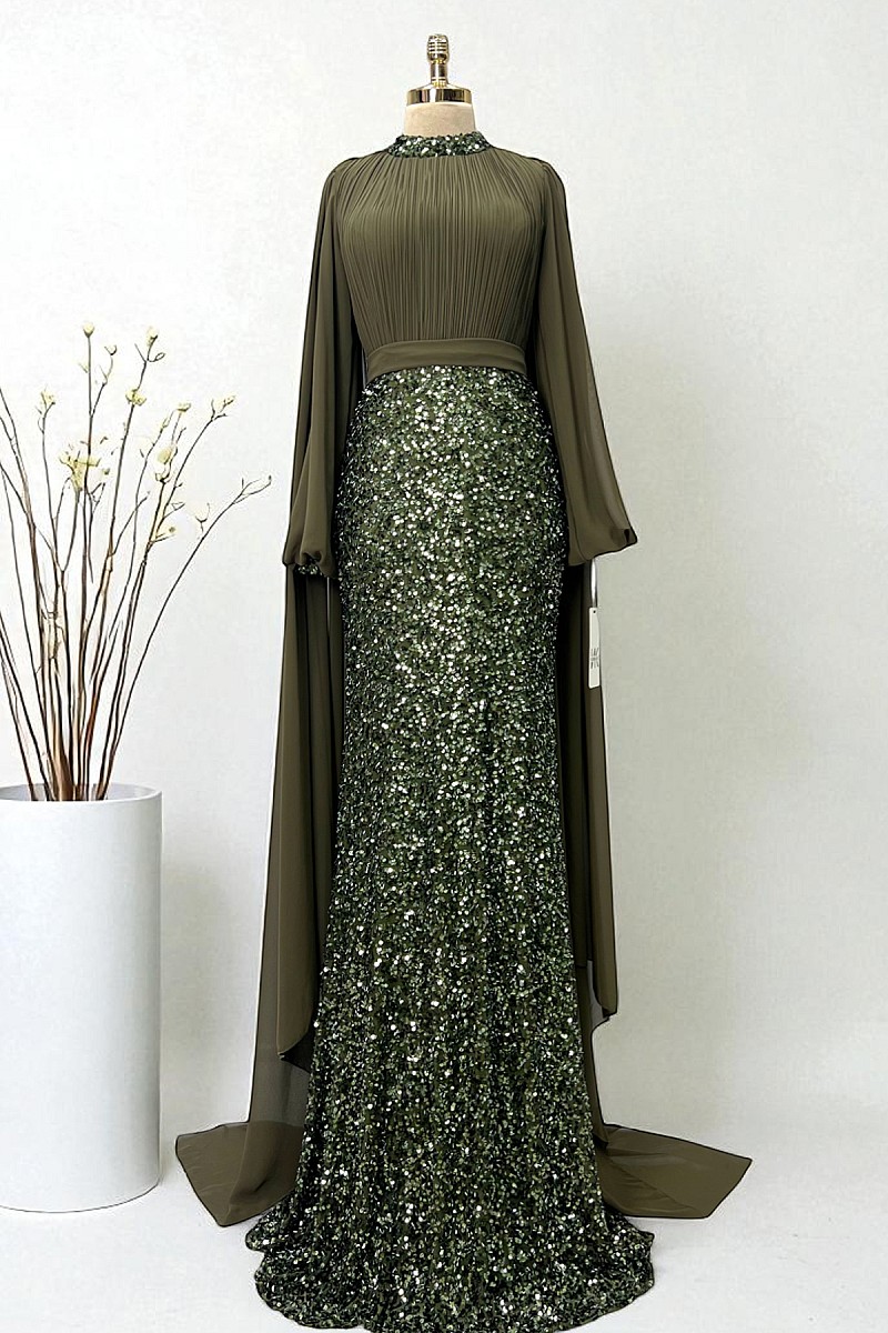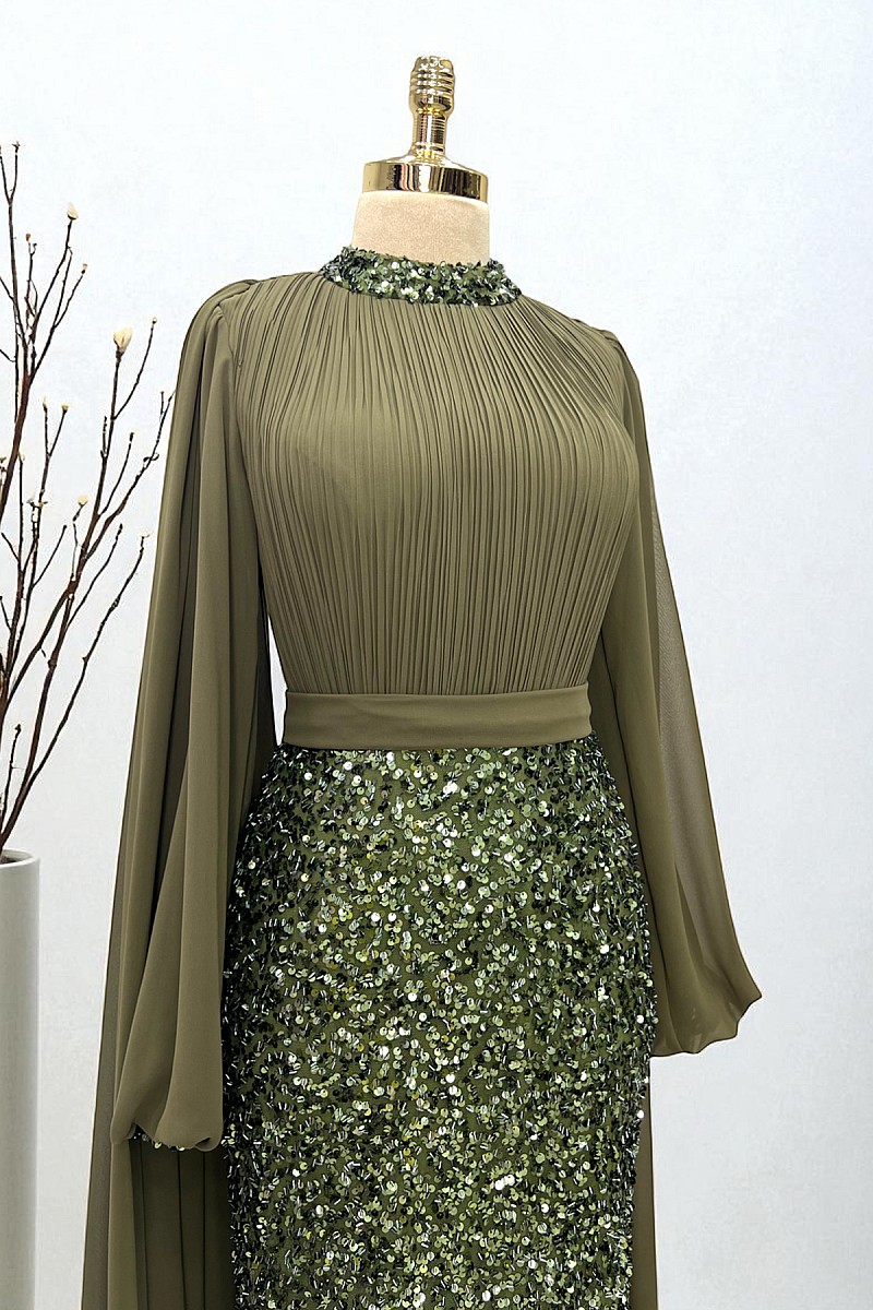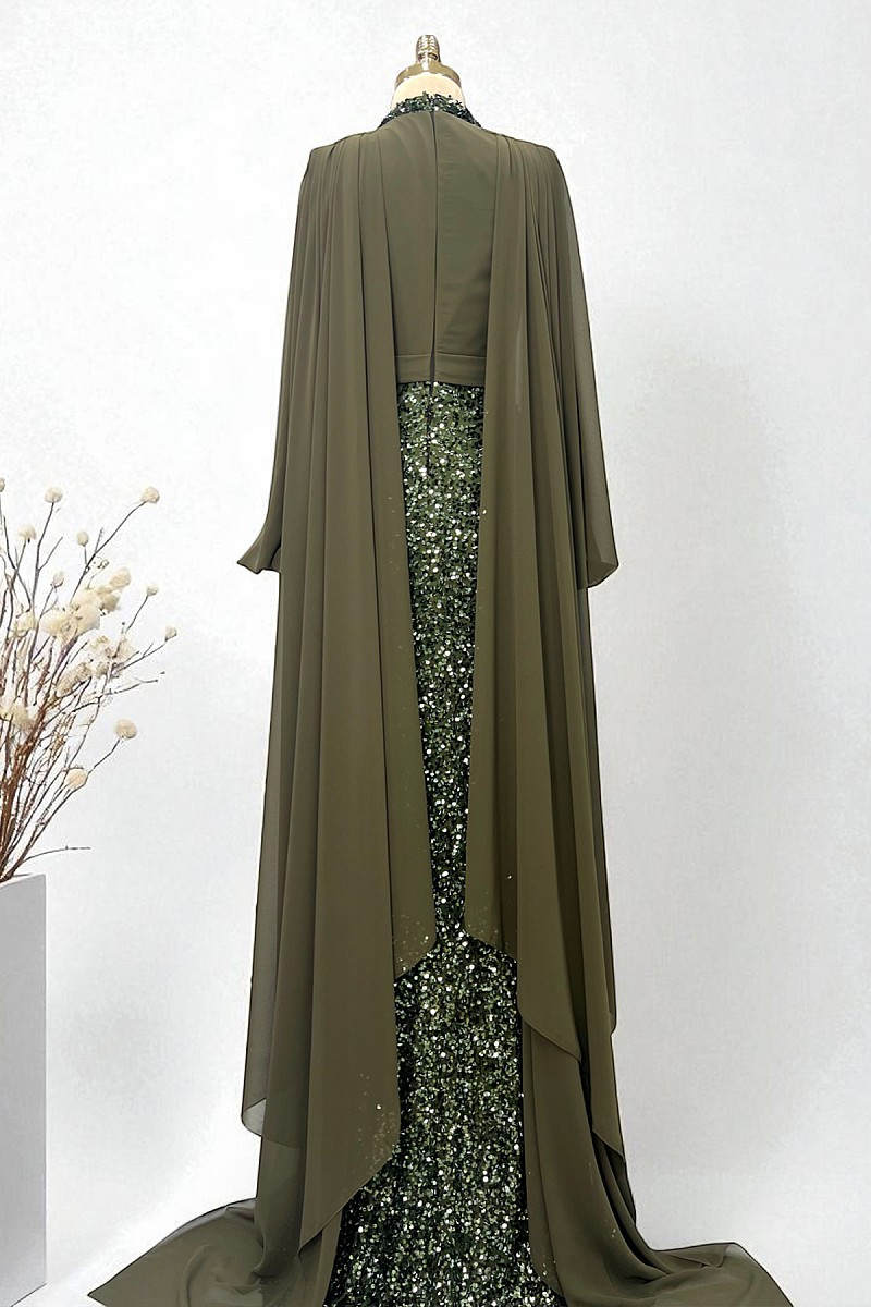 Omuz Pelerin Detay Zarif Kristal Abiye - Haki