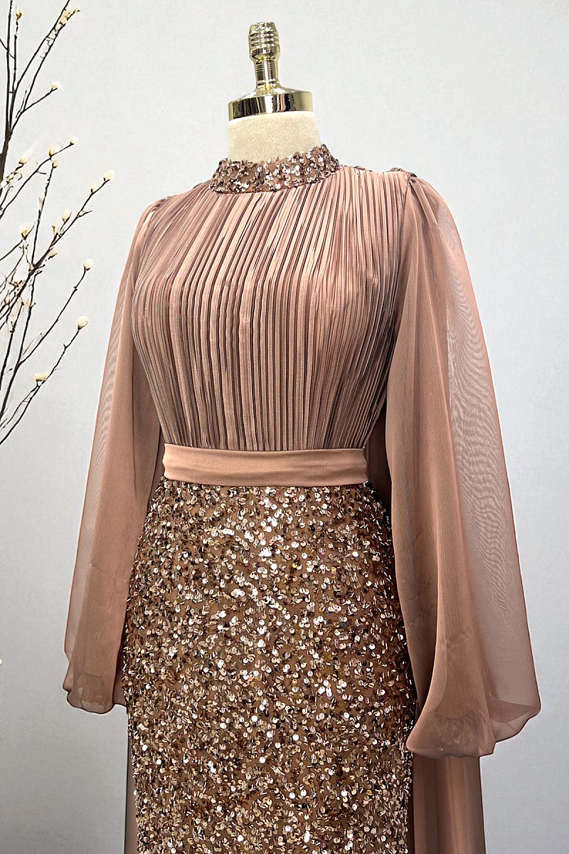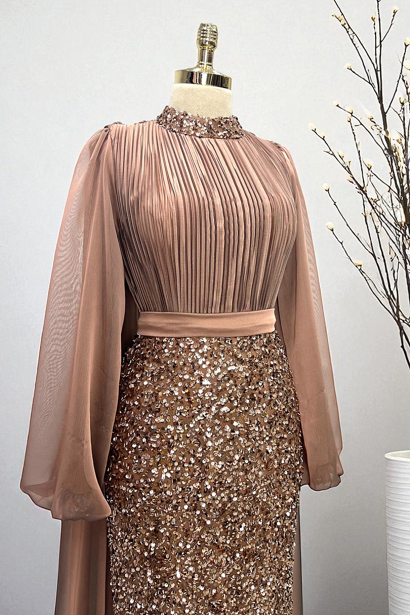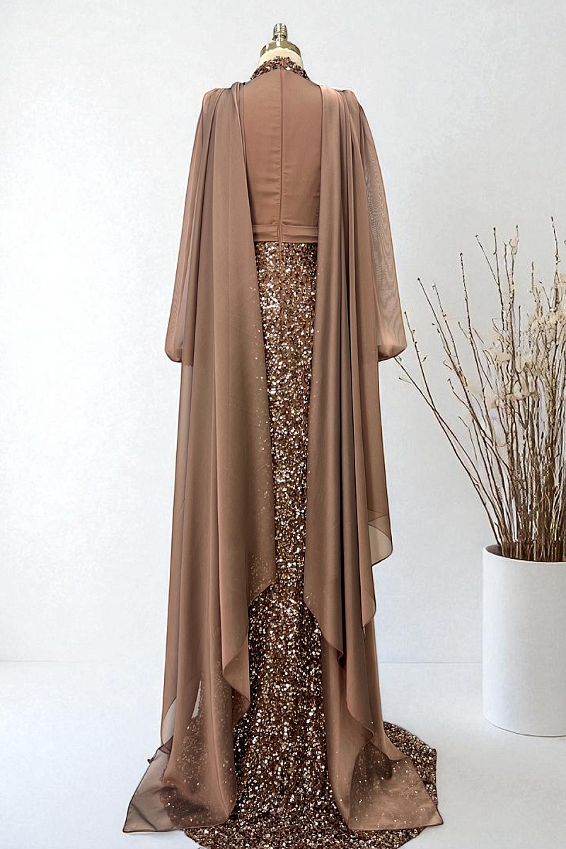 Omuz Pelerin Detay Zarif Kristal Abiye - Kahve