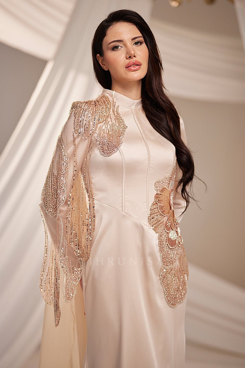 | ÜRÜN BİLGİSİ | Omuzdan dökülen zarif detayları ve çiçek formundaki özel aplikeleriyle klasik çizgiyi farklı bir yorumla öne çıkarır. |