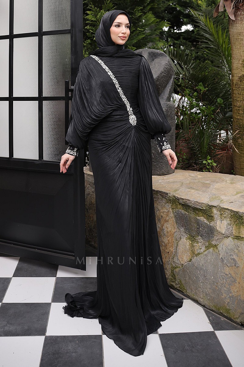 Drapeli Taş Şerit Detaylı Marceline Abiye - Siyah