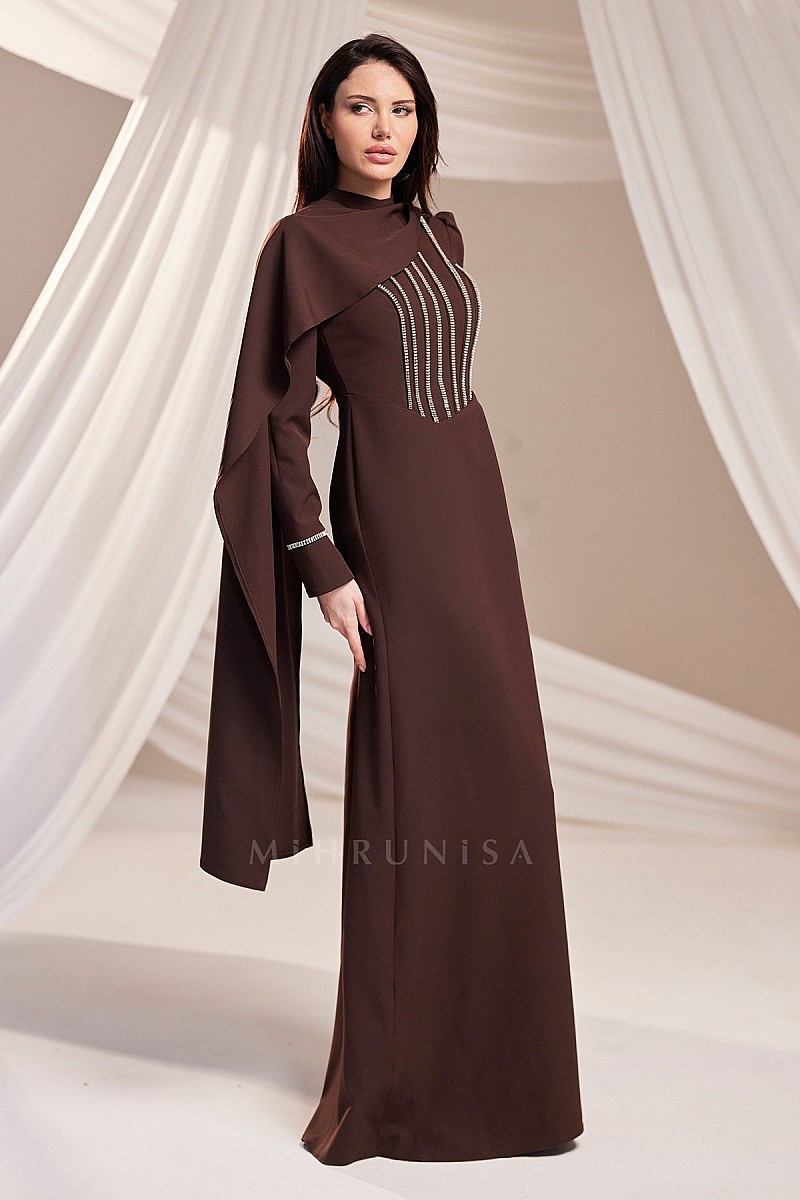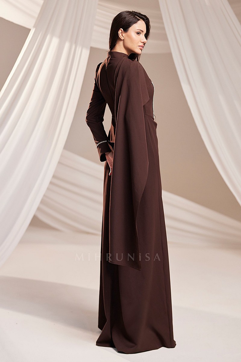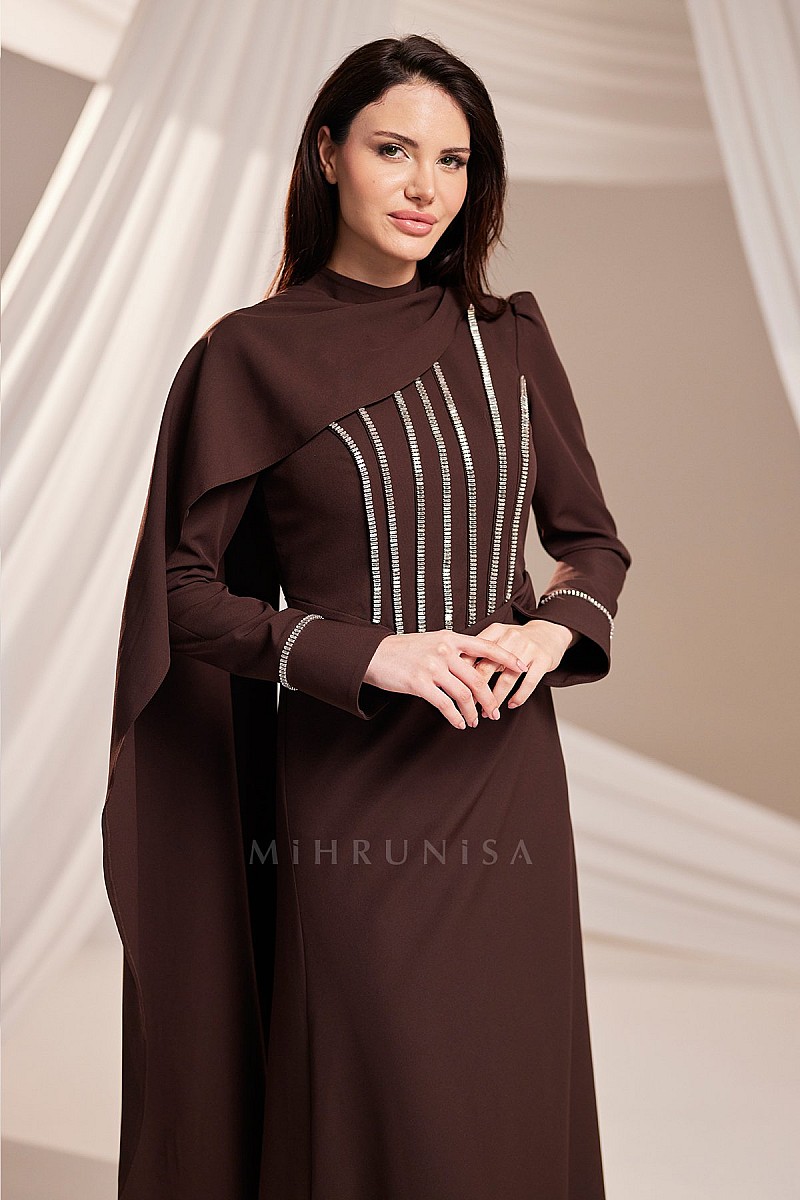 Taş Zincir Detaylı Pelerinli Ayliz Abiye - Kahverengi